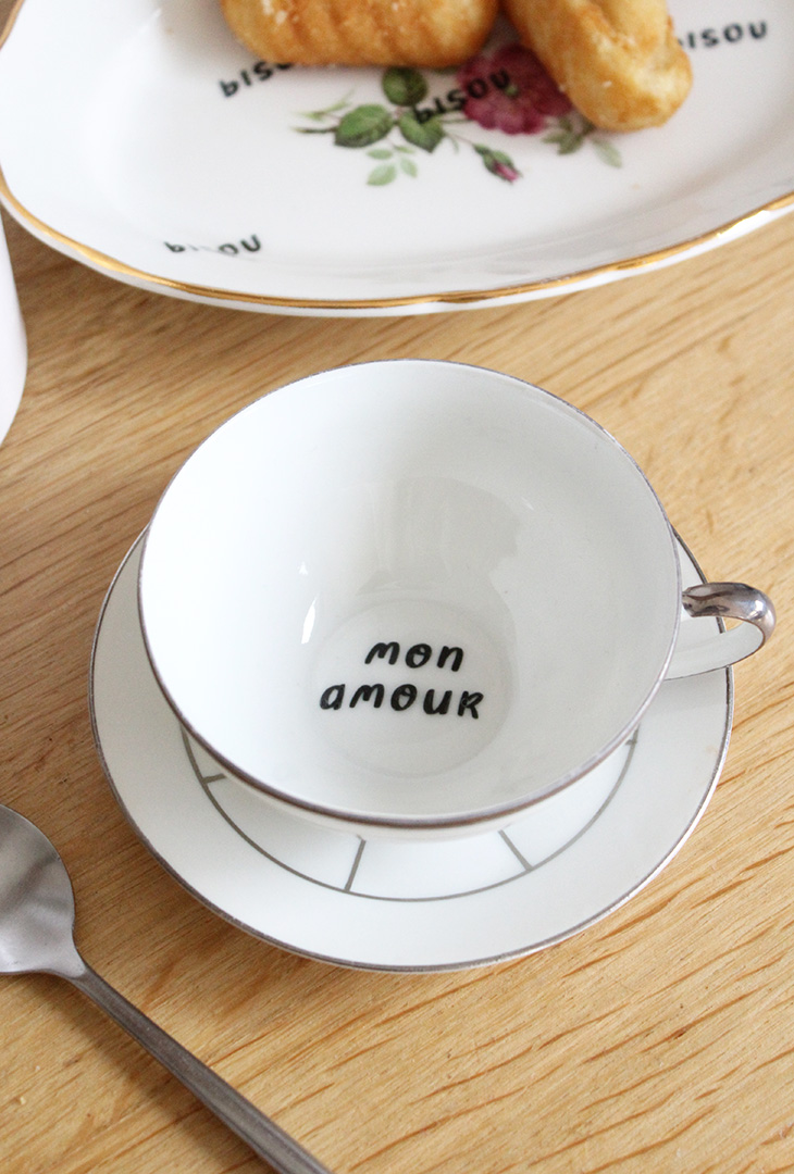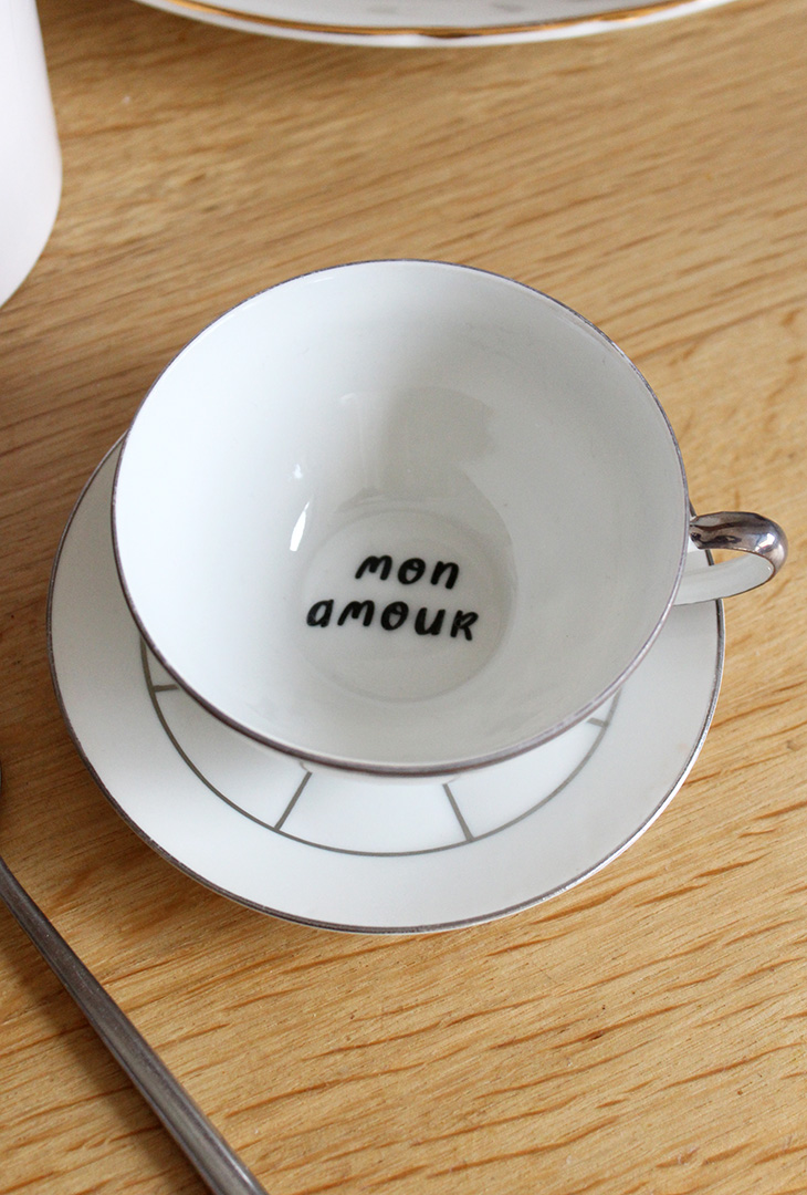 Tasse en porcelaine avec soucoupe, style très classique revisité avec « Mon amour » au fond de la tasse