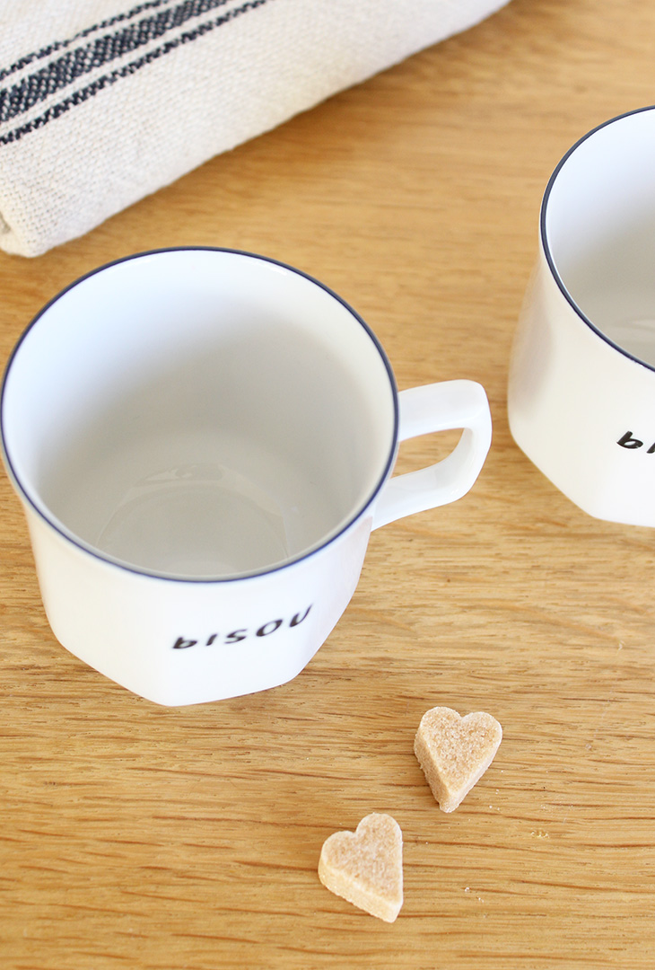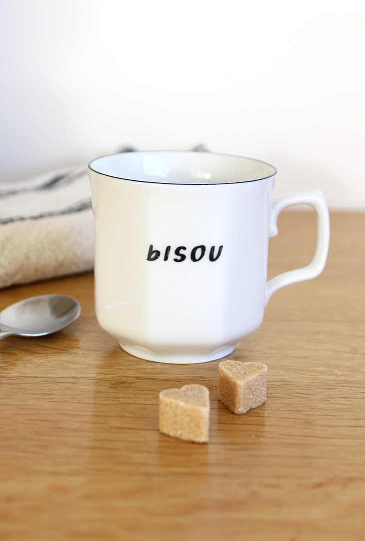 Tasse vintage blanche avec liseré bleu redécorée par mes soins